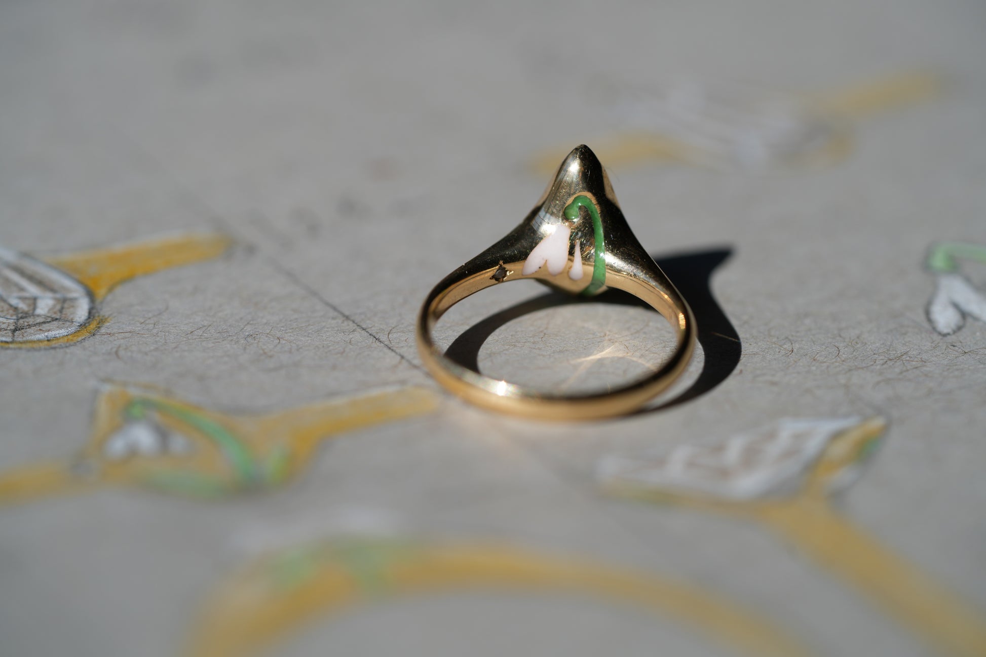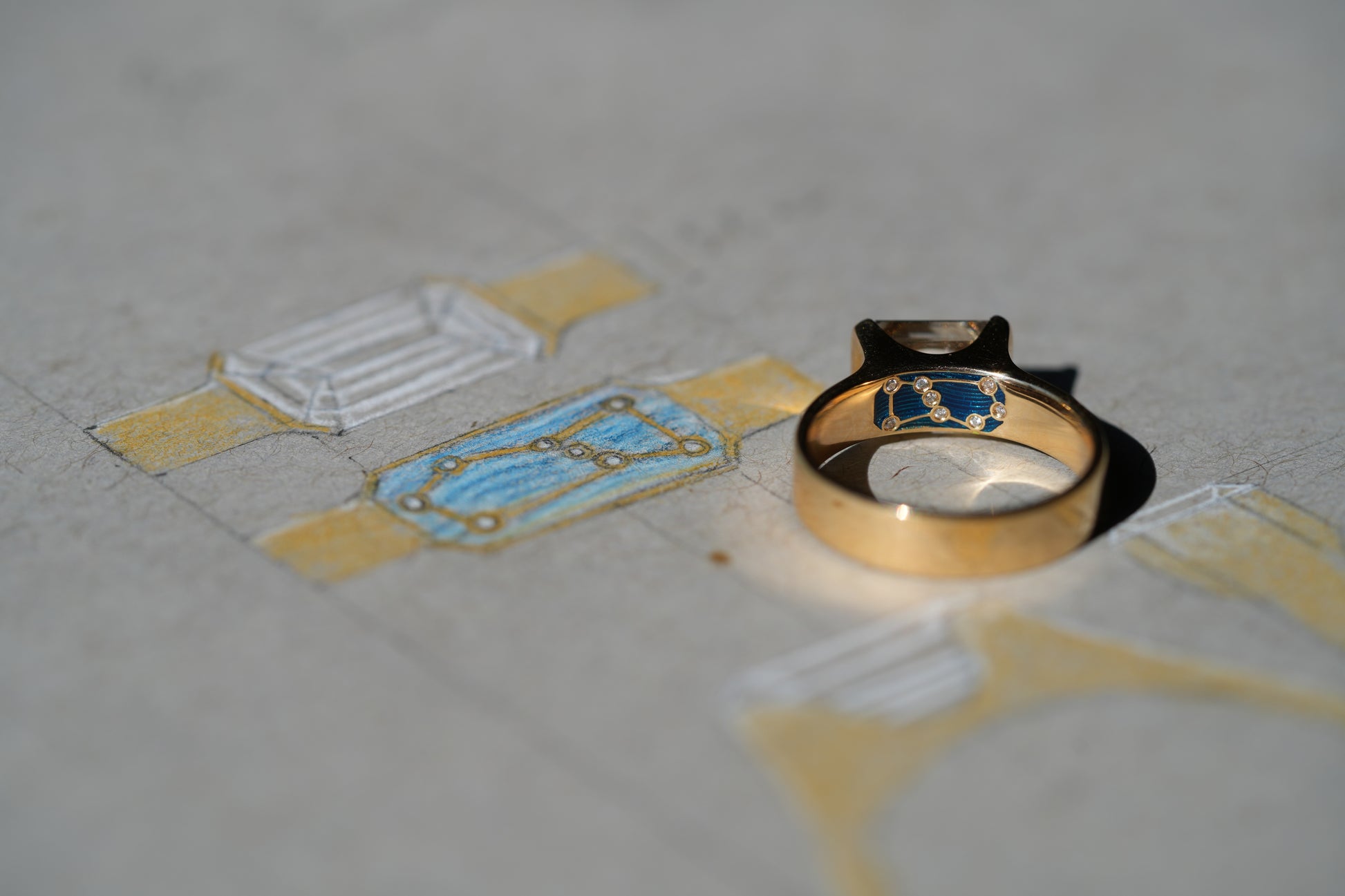 The champagne diamond band is graced with an enameled snowdrop—a tribute to their shared name—and a single inlaid diamond star for his birthstone. Its partner holds a secret galaxy: the emerald-cut diamond is set within a vault of midnight blue enamel, where a fine inlay of tiny diamonds traces the stars of Orion’s Belt. A permanent souvenir of nights spent camping under a boundless sky. Together, these step-cut diamonds—one warm, one cool—symbolize a unity of togetherness, beautifully distinct yet harmoniously one.