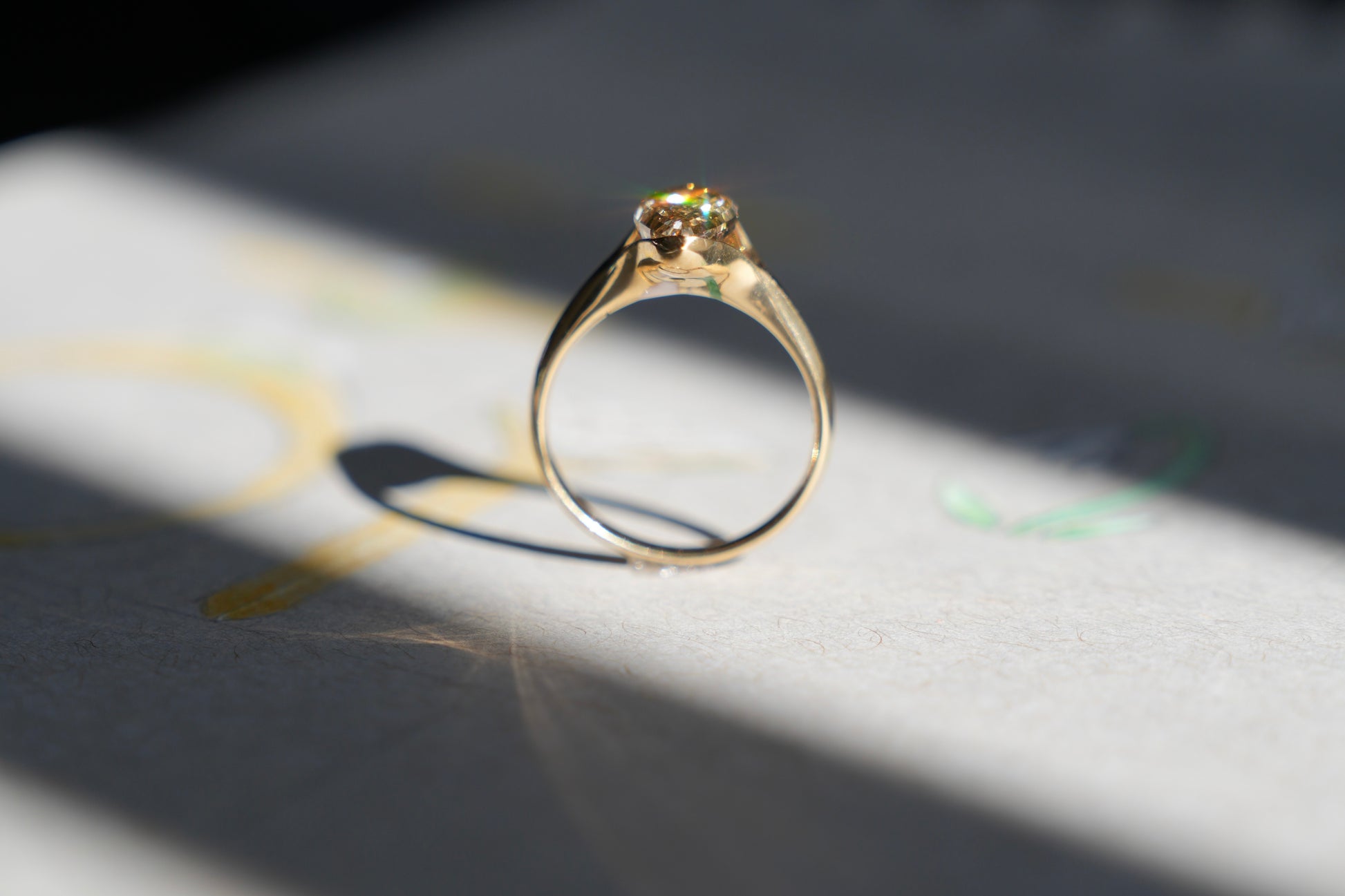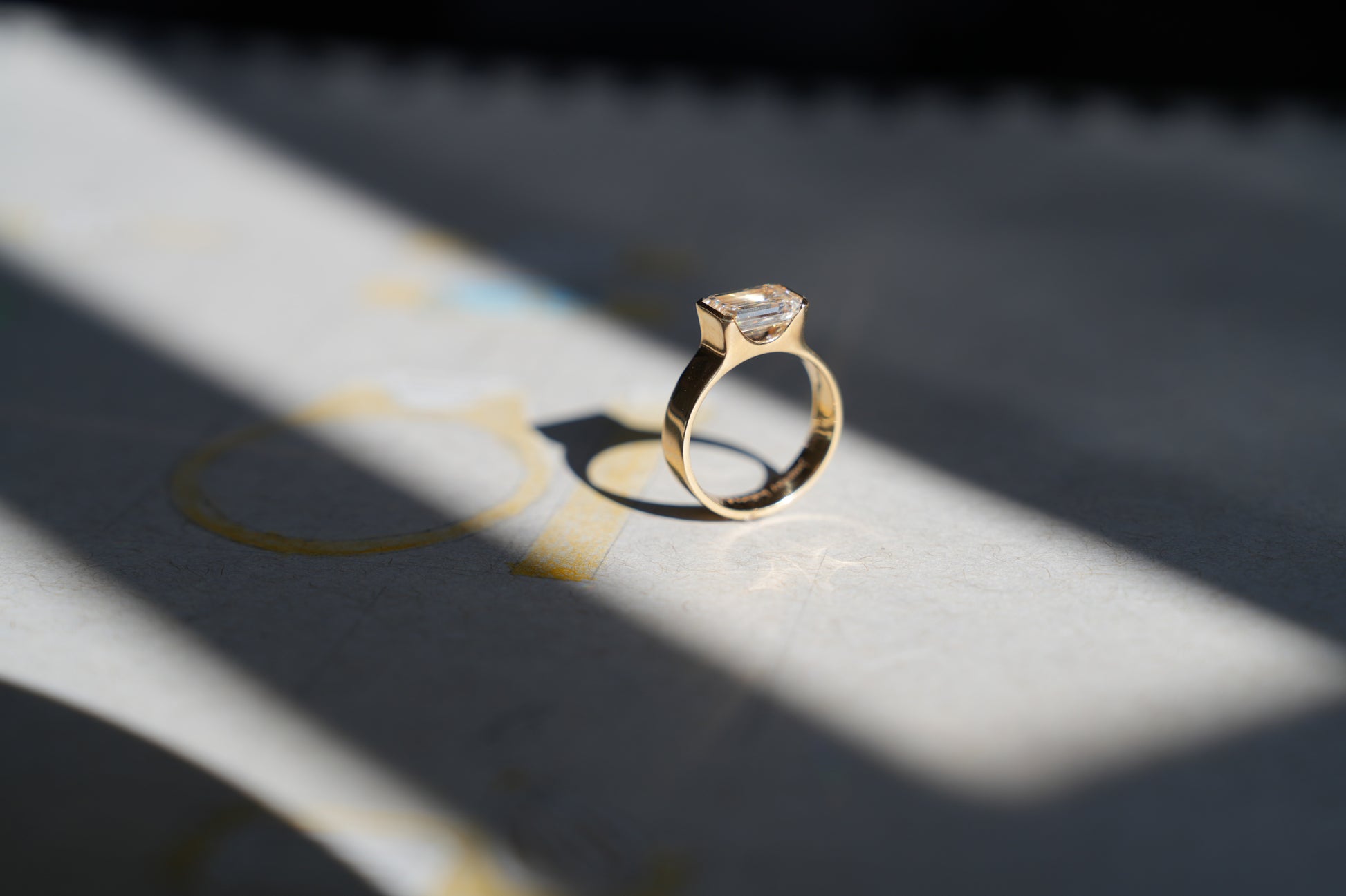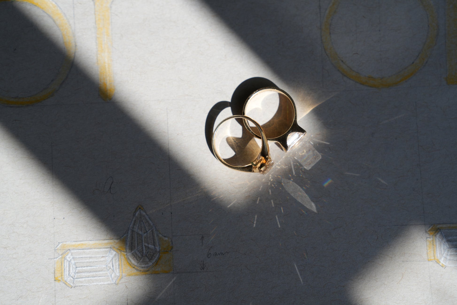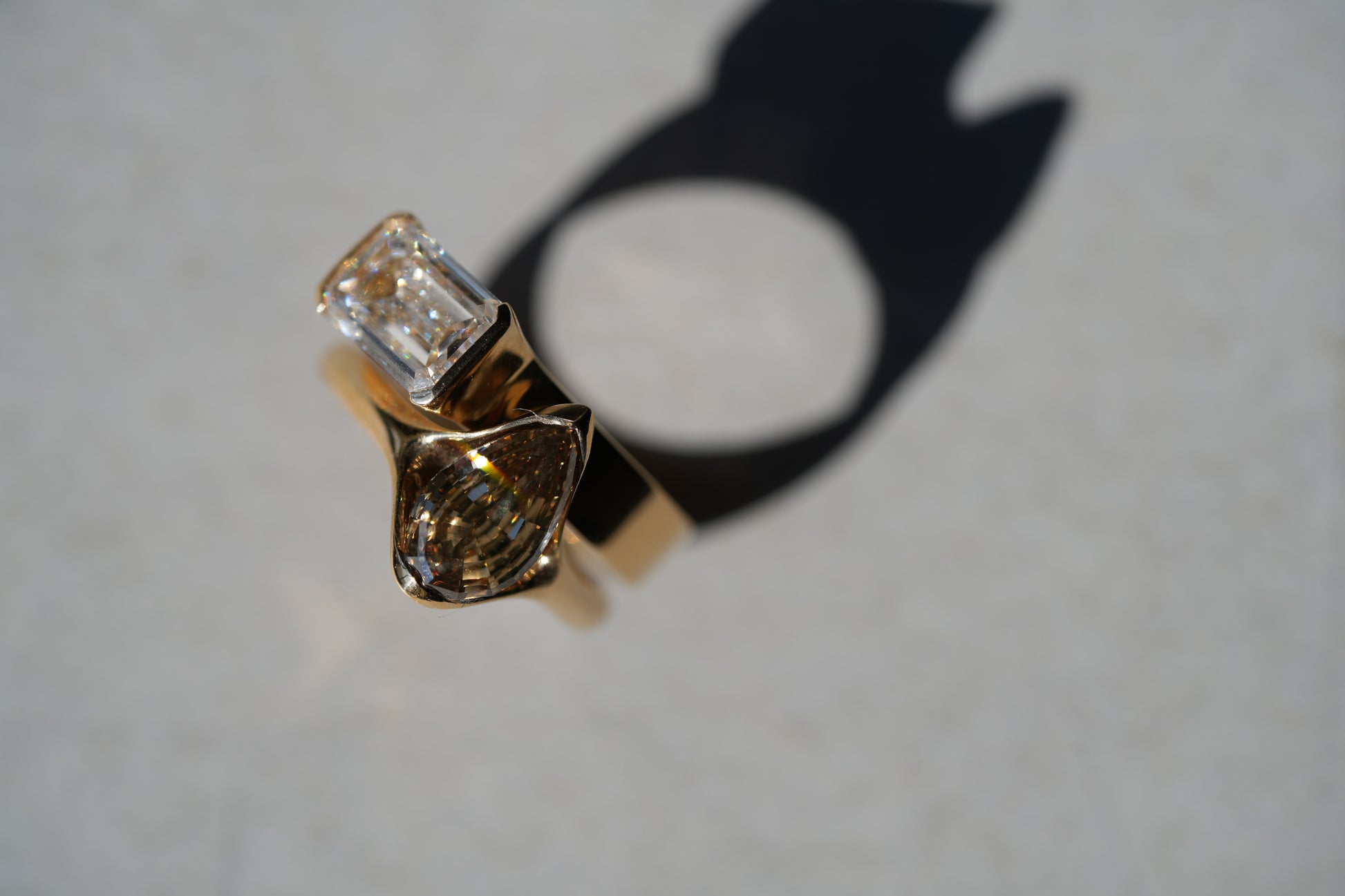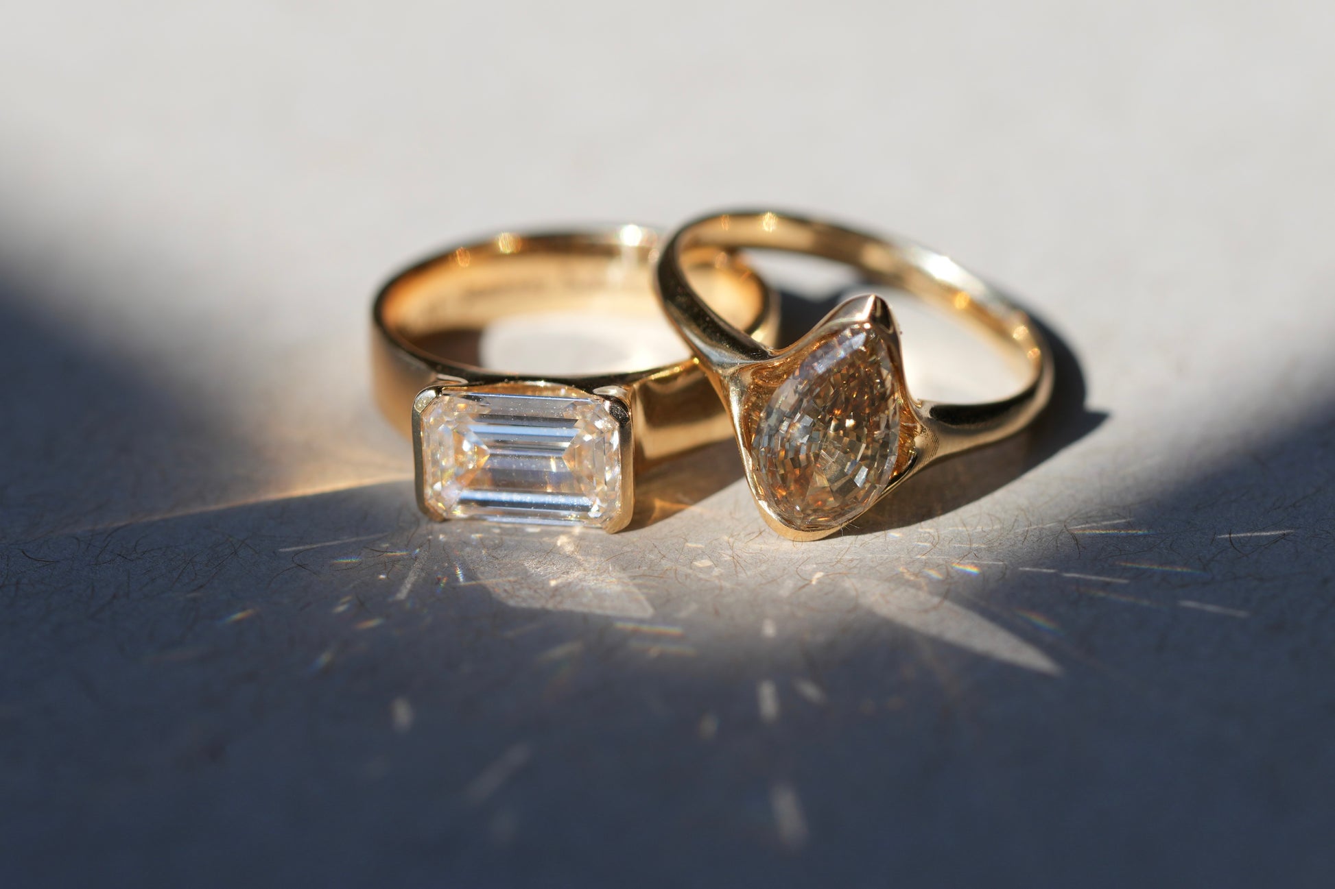Jeri’s bridal set: two rings, two stones, two halves of a whole. A warm champagne pear diamond, grounded and radiant like the earth itself. A cool, colourless emerald-cut diamond, a shard of celestial light. Worn apart, they are elegant. Stacked together, they tell a complete story.