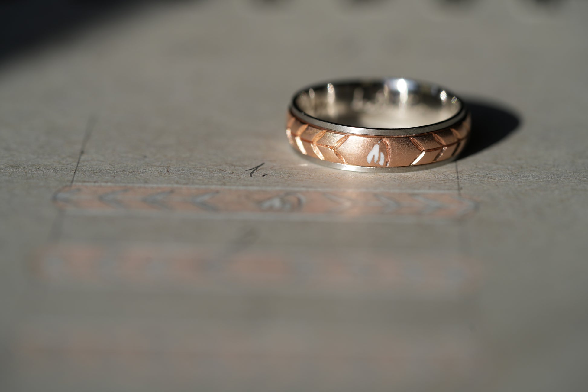 Raymond’s wedding band is a quiet echo of this promise. Forged in two metals, it mirrors the duality of his devotion: a resilient exterior of warm 18K rose gold holds a core of cool, enduring platinum. A single, subtle snowdrop is flanked by hand-engraved stems and leaves that cradle the band—a silent vow that his love will always be the steady ground for her dreams to take root.