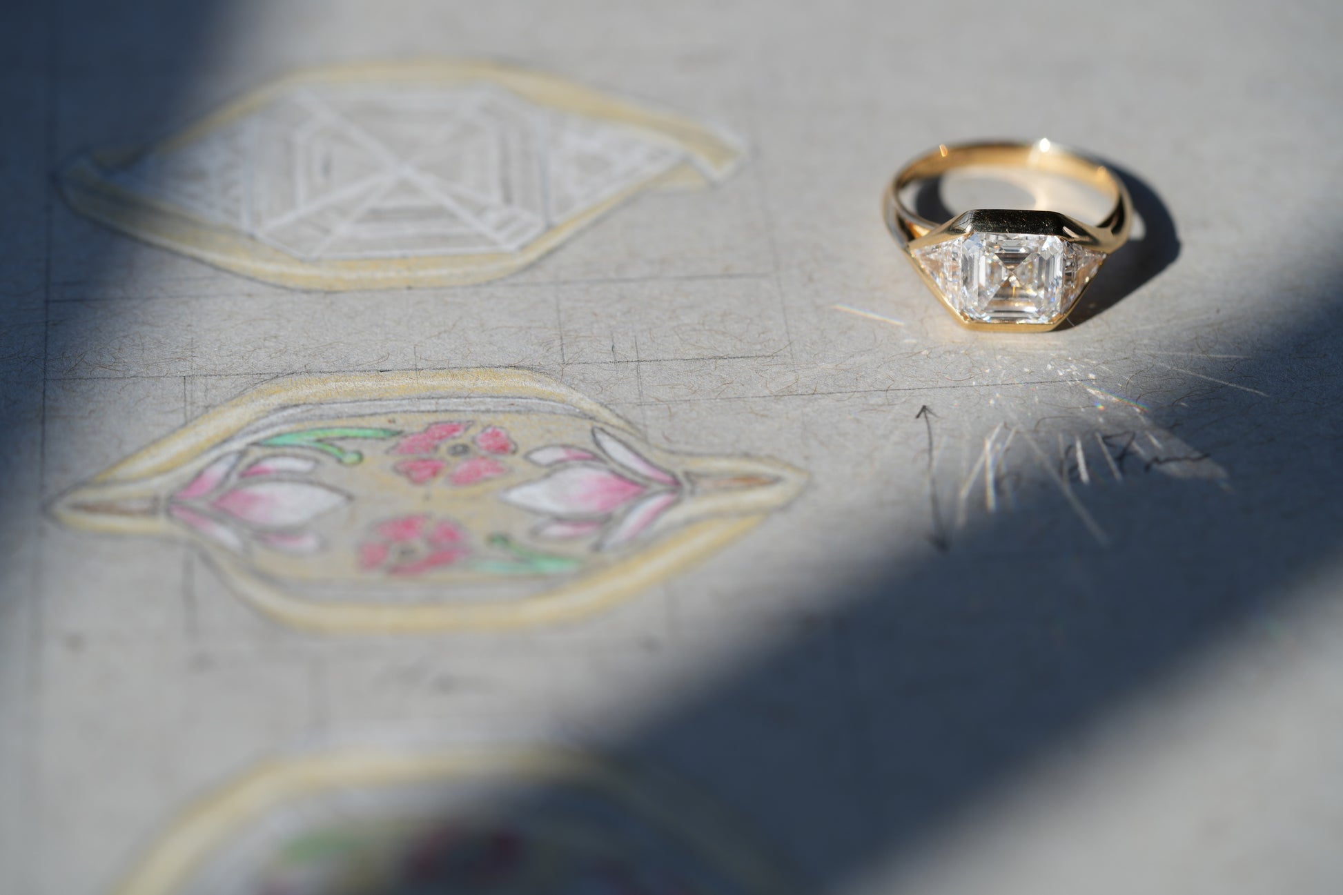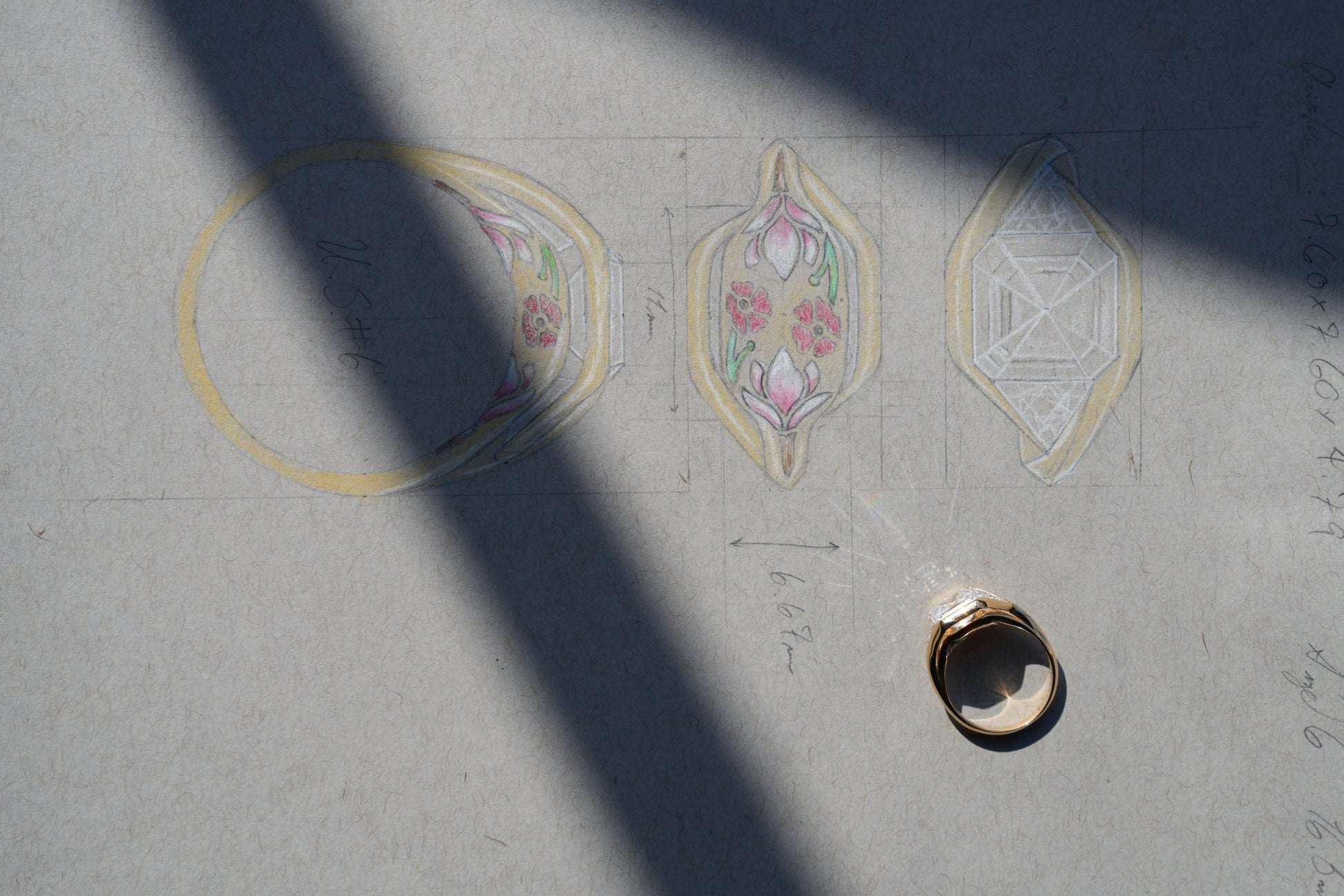 Inspired by the original Embrace Ring, this design tells a story uniquely their own. Kiera's birth flower, the poppy, is rendered in vivid red enamel, two blooms with bold black diamonds at their center. They are intertwined with graceful magnolias, reflecting the tree in her garden and the art tattooed on her skin—a secret garden of personal meaning.