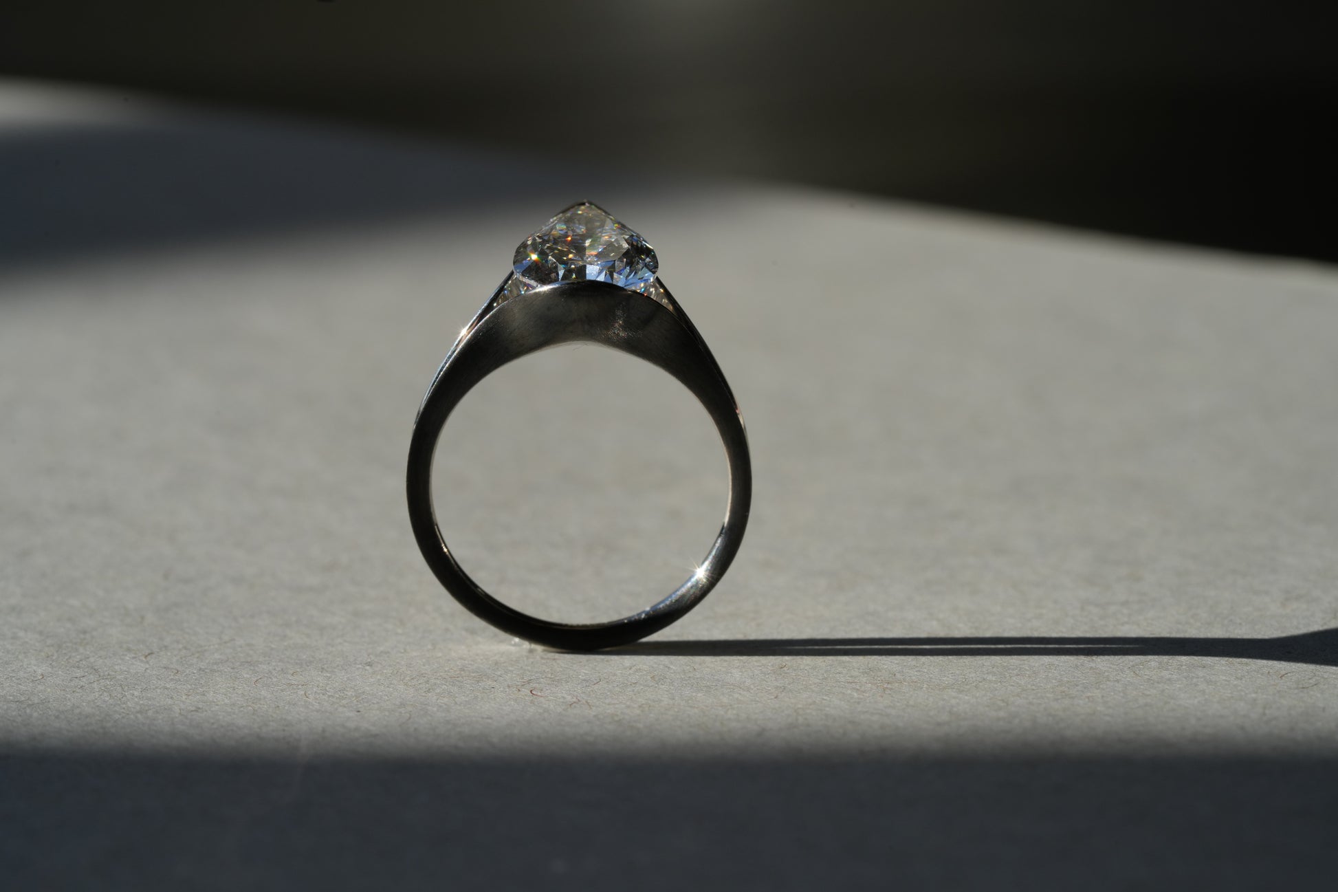 The Zen Ring, features a diamond that floats over a bed of high polish gold, with a satin black rhodium finish on the exterior.