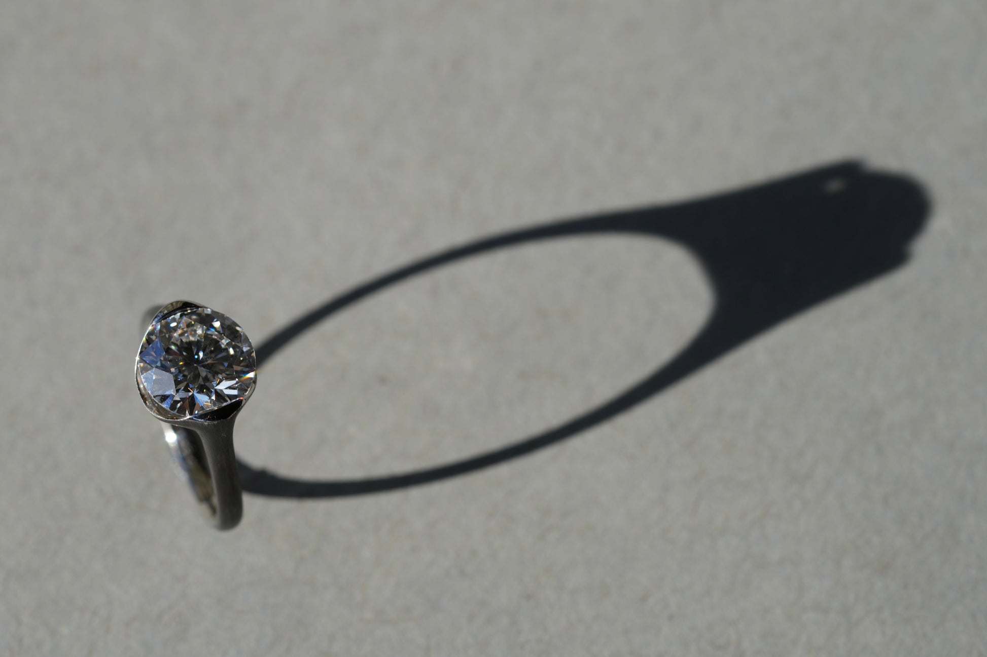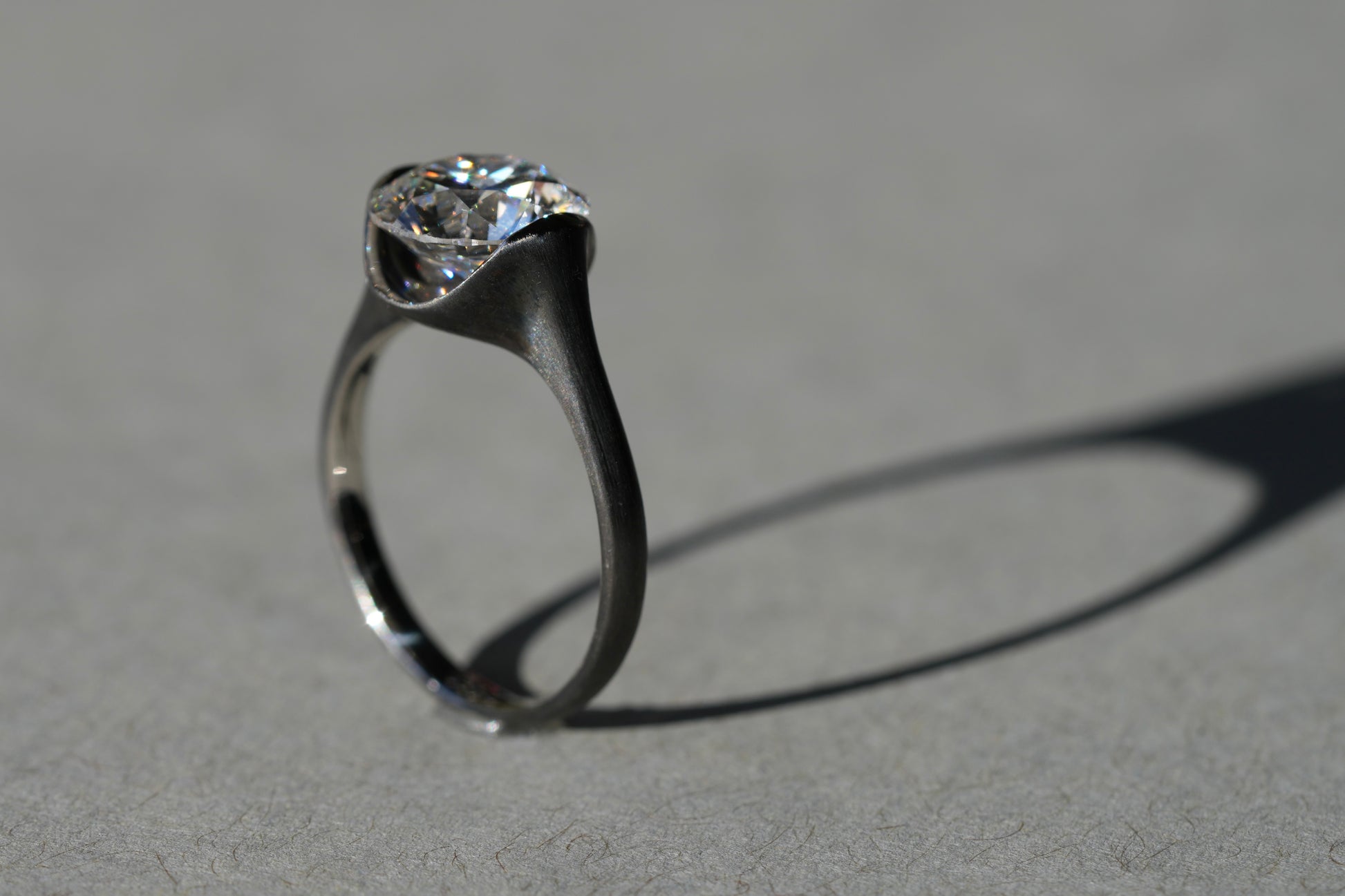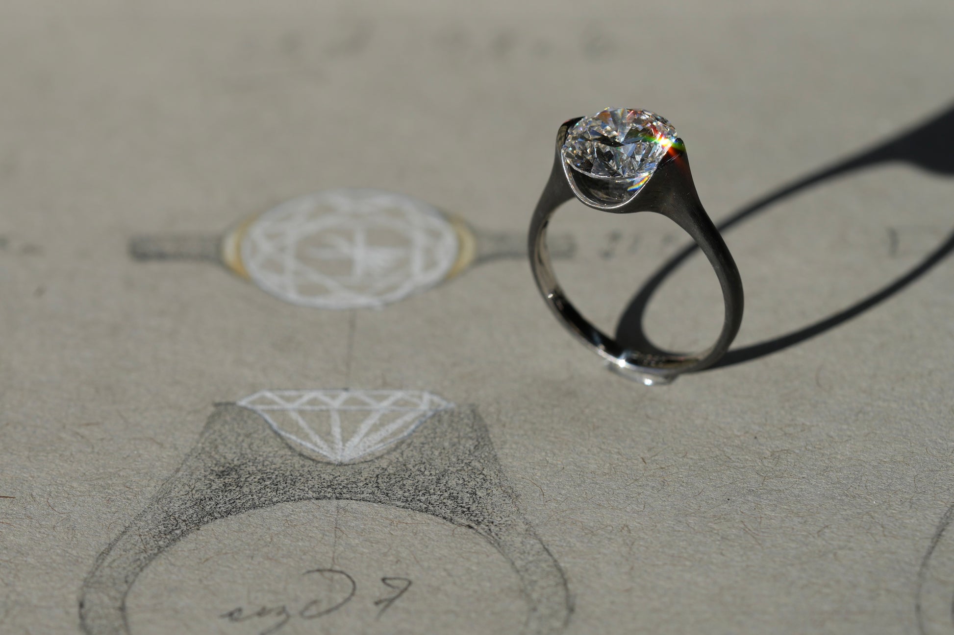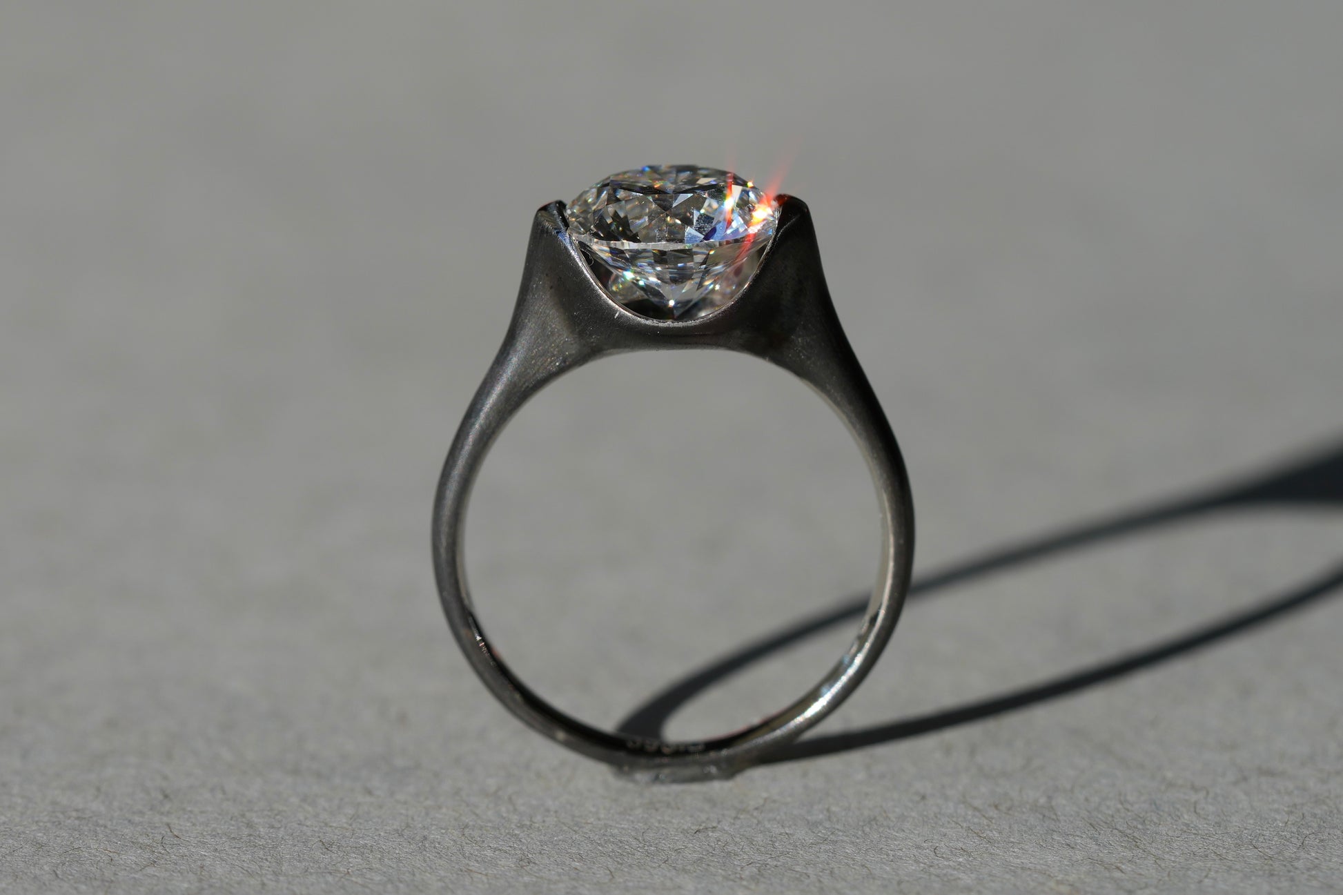 The Zen Ring, features a diamond that floats over a bed of high polish gold, with a satin black rhodium finish on the exterior.